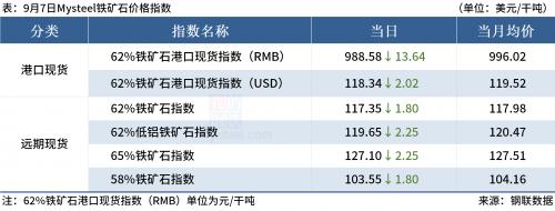 ◎9月7日,全国主港铁矿石成交127.50万吨,环比增17.8%;237家主流贸易商建筑钢材成交13.27万吨,环比增4.1%。
