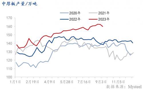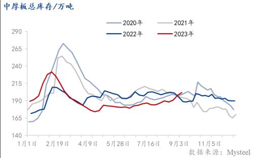 供应方面,随着近期原料强于成材,钢厂利润即将面临收缩,据Mysteel调研,9月份已有部分钢厂计划进行检修,中板产线生产积极性减弱;而目前整体资源库存处于小幅增库状态,叠加市场需求正处于逐步恢复状态,九月份供给方面压力不大。流通方面,市场表需状况表现一般,而华东与北方地区普中板价差持续处于低位,目前北方资源南下减少,华东地区多以消耗本地钢厂资源为主。北方低合金、碳板资源在途较多,且后结算政策为主,在需求萎靡不振背景下,贸易商出货压力较大,社会库存将继续回升,进而压制现货价格。需求方面,当下市场逐渐走出行情淡季,虽市场上半年景气度不足,贸易商信心被持续打压,但对于“金九”预期仍抱有一丝期待,随期货盘面拉升,及部分钢构及工程基建项目开工进程加快,刺激部分刚需释放。