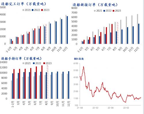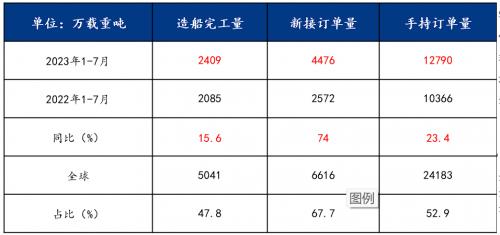 2023年1-7月,1~7月,全国造船完工2409万载重吨,同比增长15.6%。承接新船订单4476万载重吨,同比增长74%。7月底,手持船舶订单12790万载重吨,同比增长23.4%。今年以来,新船需求继续增加,交船创新年度新高,新造船价格环比连续7个月保持增长。本轮市场船型轮动的特点明显,船东结构也在发生变化。欧洲船东在减排规则基本清晰的背景下加快船队转型,正在开启一轮关于绿色运力竞争的“新赛道”。