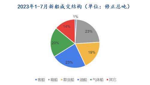 油船、散货船份额提升较快,箱船需求依然不减。1-7月,以CGT计,成交船型占比份额依次为油船(23%)、集装箱船(23%)、气体运输船(20%)、散货船(19%)、其它船舶(14%)以及客船(1%)等。油船继续保持第一,同比增长271.8%;其它类船舶其次,涨幅为48.4%;散货船增长16%;其余主力船型成交同比减少。然而,7月当月箱船再夺头筹,并且同比降幅明显收窄,说明箱船的市场需求依然可观。