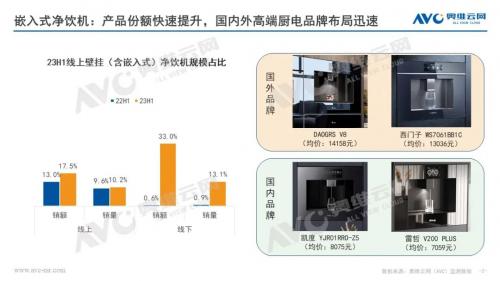 近几年,在厨房场景中,嵌入式产品层出不穷,嵌入式冰箱、嵌入式洗碗机、嵌入式蒸烤箱高速发展,嵌入式净饮水产品应运而生。奥维云网(AVC)监测数据显示,线上壁挂式净饮机(含嵌入式)销额、销量份额同比增加4.5%、0.6%,线下壁挂式净饮机(含嵌入式)销额、销量份额同比增加32.4%、12.1%。