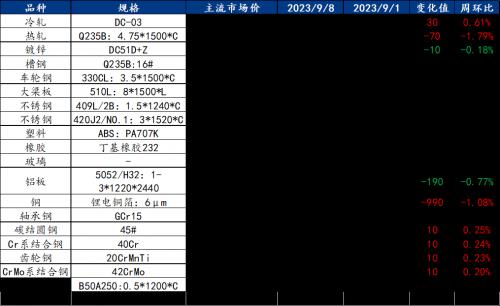 截止2023年9月8日,各原材料当日即时价格以及价格周环比情况如下: