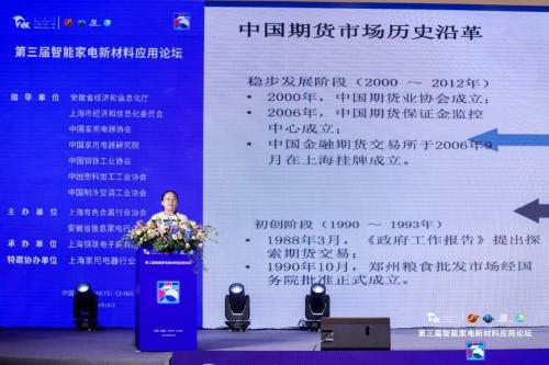 上海期货交易所商品一部高级研究员韩自然博士指出,家电是有色金属非常重要的下游应用领域之一,上期所目前已经形成了涵盖有色、黑色、贵金属、能源化工等领域的完整产品体系,已经上市了有包括铜、铝在内的23个期货品种,以及9个期权。她还提出,有色期货是服务国家保供稳价的重要工具,目前上期所有色金属的期货价格已经成为我国宏观经济管理部门监测行业运行的重要指标。