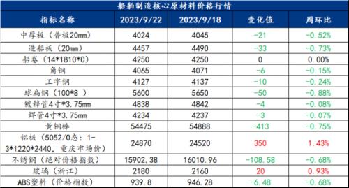 截止2023年9月22日,各原材料当日即时价格以及价格周环比情况如下: