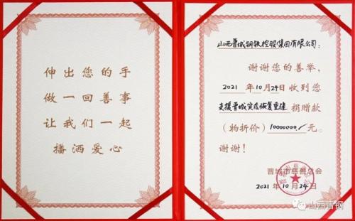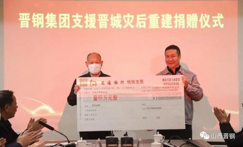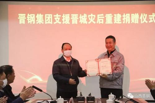 10月初,山西省出现了历史以来最强秋汛,晋城部分地区连日遭受暴雨侵袭,给灾区群众的财产造成了严重损失。灾情牵动人心,救援迫在眉睫。24日上午,晋钢集团副总裁郑品院将象征着公司大爱的“1000万元支票”郑重地交到晋城市副市长王宏微手中。这是晋钢主动担当作为的生动实例,更是集团多年来扎根晋城、发展晋城、服务晋城、奉献晋城的生动写照!