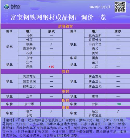 成都钢铁网资讯10月2日消息:一、宏观消息1.央视新闻:这两天,全国大部分景区陆续出现客流高峰。9月30日,在洪崖洞景区,游客数量达到11万人次,较节前28日增长近1倍。在山西平遥古城景区,假期前两天客流量已经接近9万人次。故宫博物院目前仅有10月6日下午还有剩余门票,中国国家博物馆假期门票已经约满。2.9月,财新服务业PMI为50.2,再创年内新低,前值51.8;财新制造业PMI为50.6,前值51。二、产业行情最新消息1.中指院:9月,百城新建住宅平均价格为16184元/平方米,环比由跌转涨,涨幅为0.05%;同比跌幅收窄至0.10%,价格有所企稳。百城二手住宅平均价格为15556元/平方米,环比下跌0.44%,已连续17个月环比下跌;同比跌幅扩大至2.59%。2.浙江省慈溪市:自10月1日起至2024年6月30日在慈溪市购买新建商品住房的个人,购房人在完成所购房屋的不动产所有权登记后可申请购房补贴。对符合条件的新建商品住房购房者一次性给予不高于购房发票价款1%的补贴,最高不超过4万元。三、今日动态【建材】2日唐山迁安地区普方坯资源出厂含税稳,报3480元,钢厂方面,长江稳,马钢稳,九江稳,安丰稳;邯郸裕华金鼎太行稳,石家庄澳森涨10,福州三钢稳。美联储11月维持利率不变的概率为86.8%,9月,制造业PMI为50.2%,环比上升0.5个百分点,4月以来重返扩张区间,今日市场主流稳中偏强调整,需求跟进不足,备货意愿不强,实际成交疲软,预计明日持续稳中调整【管材】唐山管材主流持稳,个别小厂窄幅调整10-20,唐山主流焊管报4160稳,主流镀锌管报5020稳,节日期间,市场交投氛围冷清,需求低迷,部分厂家停产放假、暂不报价,节日氛围浓厚,观望为主。预计短期管材价格稳中整理。【涂镀】今日涂镀主流价格主稳运行,博兴价格稳报4000元/吨,在处于假期需求差的情况下,商家多持稳观望,市场成交平平,下游采买意愿不强,预计明日价格坚挺盘整。【热卷】今华北热卷价格持稳运行,假期期间商户观望为主,询单人数寥寥,下游操作积极性不高,预计短期市场价格稳中整理为主。唐山热带时讯:唐山145系窄带主流持稳报3740含税出厂,整体成交偏弱;285-355系市场裸价现货3480-3500(主流3485)宏兴3490,现货较昨午后收盘价几无变动,其中宏兴期货资源3490-3495。钢贸商多休市放假,市场报价寥寥无几,交投表现冷清,终端亦随采随用为主。考虑节间带钢库存及钢坯库存双增,市场供给压力凸显,预计带钢或稳中有弱调整。【型材】唐山型材维稳运行。角5-6.3#3790;槽8-16#3780;工14-20#3810。假期期间需求难有明显释放,下游观望心理浓厚,部分中间商低价按需拿货,市场交投一般,预计假期期间型价将主流持稳运行。【中板】今华北中板持稳观望,唐山3860稳,武安普阳3830稳,假期第四天市场维稳观望,商家出价不积极,需求跟进谨慎,整体成交偏差,钢厂锁价以稳为主,库存方面仍存一定压力,料近维稳运行。【冷轧】今华南冷轧持稳运行,现乐从4700,节假日个别商户有报-价,市场需求跟进不足,下游终端多持观望态度,成交表现趋弱,预计短期价格稳中整理。四、今日调价