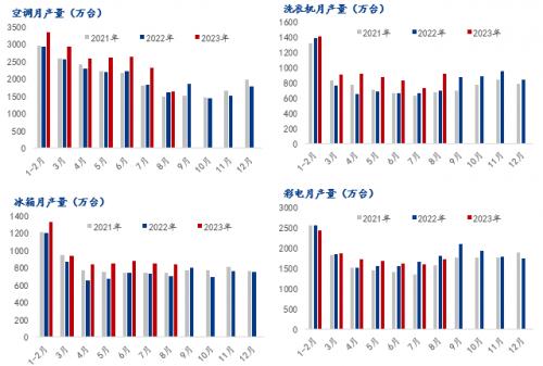 2023年1-8月中国空调累计产量同比增长16.5%,冰箱产量累计产量同比增长14.5%,洗衣机产量累计产量同比增长23.6%,彩电产量同比增长4.8%。