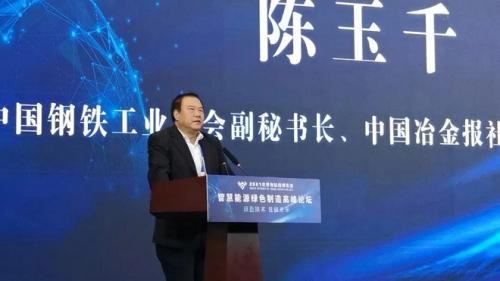图为中国钢铁工业协会副秘书长,中国冶金报社党委书记、社长陈玉千为智慧能源绿色制造高峰论坛“双碳”目标驱动冶金行业高质量发展分论坛致辞