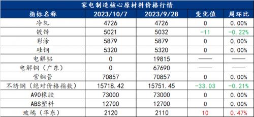 截止2023年10月7日,各原材料当日即时价格以及价格周环比情况如下: