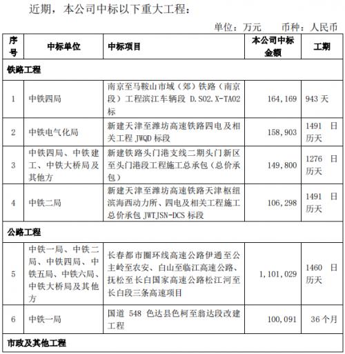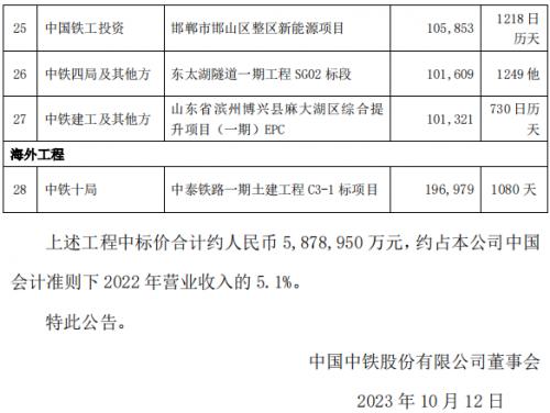 10月11日,中国中铁发布公告,近期公司中标28个重大工程项目,中标价合计约5878950万元,约占公司中国会计准则下2022年营业收入的5.1%。