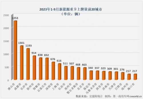 2023年1-9月,全国31个省(市、区)都有新能源重卡挂牌上路。具体到城市来看,2023年1-9月全国已有222座城市有新能源重卡上牌(9月新增7城),其中已有41座城市上牌量超百辆,上牌量超200辆的城市达到22座,唐山、成都、长沙、徐州、邯郸、石家庄、深圳、上海、长治、郑州等10座城市上牌量已超过500辆。