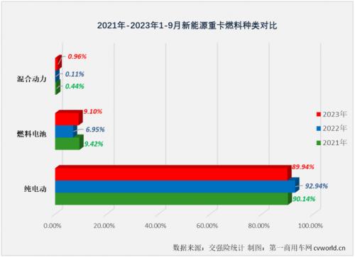 根据第一商用车网掌握的数据,2022年全年纯电动车型(包括换电式纯电动)在新能源重卡销量结构占比达到90.08%,新能源重卡市场以纯电动为主要技术路线的特点也延续到了2023年。2023年1-9月,纯电动车型在新能源重卡市场占到89.94%的份额,较去年全年占比略有下滑,与去年同期相比更是缩窄不少(如下图)。