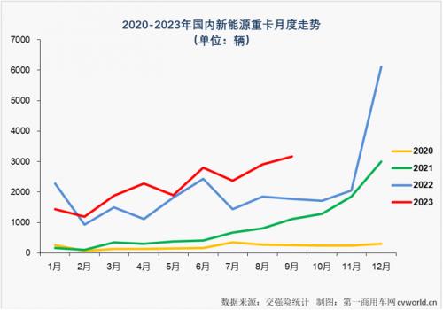 上图可见,代表2021年的绿色曲线几乎一直处于2020年的黄色曲线上方,代表2022年的蓝色曲线则从1月到12月始终处于2021年的绿色曲线上方。2023年,新能源重卡市场的发展“曲线”与前两年大不相同,开始与上年曲线有了“相交”,这代表今年的新能源重卡市场不再只有“增长”一种声音,同时也说明新能源重卡市场已经进入有涨有跌的成熟阶段(虽然截止到9月份仅“相交”过一次)。上图还可见,今年一季度3个月新能源重卡市场销量所处的高度,放在2022年里看处于较低位水平;二季度开始销量走势变得跌宕起来: 4月份所处的高度高出去年同期一大截,5月份再次贴近2022年的蓝色曲线,6月份又出现明显“拉升”,7月份销量虽环比有所下滑,但由于去年同期销量更低,红色曲线与蓝色曲线的距离再次拉开,8、9两月新能源重卡市场又再次“跑”出了环比、同比双增的线条。上图还可见,今年9月份所在高度放在我国新能源重卡发展史上也是高位水平(仅低于2022年12月)。