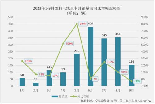 上图可见,今年燃料电池重卡市场销量在1-4月起伏很大,5月份开始连续4个月销量保持在200辆以上,9月份,燃料电池重卡销量再次不足200辆,但由于5-8月的良好表现,9月过后,今年燃料电池重卡市场综合表现仍比去年好了一大截。