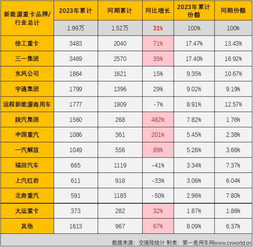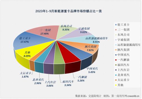 从市场份额看,2023年1-9月,徐工新能源重卡累销3483辆暂列榜首,累计份额达到17.47%,较上年同期提升了4.04个百分点;三一新能源重卡以3469辆的累计销量紧随其后暂列第二位,今年1-9月累计份额达到17.40%,是另一家累计销量超过3000辆,累计份额超过10%的企业,三一累计份额较上年同期提升0.48个百分点,三一与徐工目前累计销量仅相差14辆,榜首之争越来越激烈了;东风、宇通、远程和陕汽等四家企业累计销量均超1500辆,分别达到1864辆、1799辆、1777辆和1560辆,列3-6位,在2023年1-9月的新能源重卡市场分别抢到9.35%、9.02%、8.91%和7.82%的份额,4家企业销量差距同样不大,排名互换随时都可能发生;排名7、8位的重汽和解放累计销量也双双超过1000辆,分别达到1086辆和1049辆,累计份额分别达到5.45%和5.26%,两家企业市场份额较去年同期均有提升;福田、红岩和北奔3家企业累计销量均超500辆,今年1-9月累计份额分别为3.34%、3.06%和2.96%,分列9-11位,三家企业差距同样不大,排名第11位的北奔仅比排名第10的红岩累计少销售20辆;排名第12位的大运累计销售373辆,累计份额为1.87%。