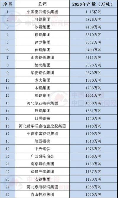 6月3日,世界钢铁协会发布了《世界钢铁统计数据2021》。中国宝武以1.15亿吨位居全球第一,河钢集团、沙钢集团、分别以7846万吨、4159万吨、位居第三、四位。2020年,国内超1000万吨产量的钢企仅25家,分别是: