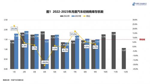 2023年10月12日,中国汽车流通协会发布2023年9月份“汽车经销商库存”调查结果:9月份汽车经销商综合库存系数为1.51,环比下降1.9%,同比上升2.7%,库存水平在警戒线以上,经销商库存压力有所好转。