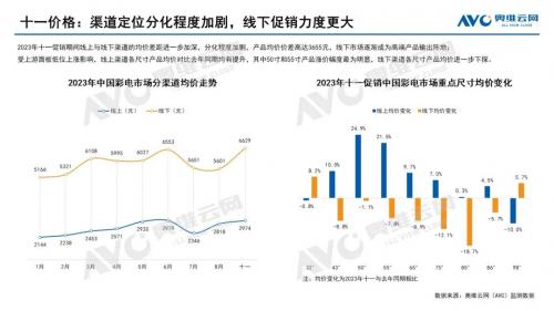 (三)高端升级:结合上游面板价格向上调整、产品结构持续升级发展的影响,十一促销期间中国彩电中高端市场整体表现良好。据奥维云网(AVC)监测数据显示,3000元及以上的中高端市场中,线上市场销量占比增长了14.2个百分点,线下市场销量占比增长了5.5个百分点。