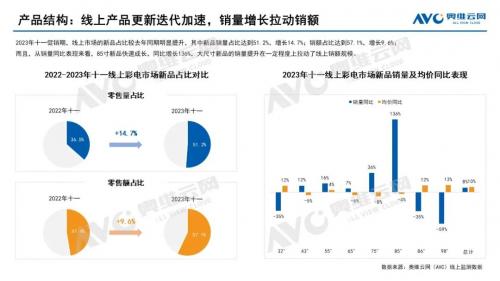 (二)产品升级:2023年十一促销期间,线上市场的结构升级、均价增长主要是由于新品占比提升带动,据奥维云网(AVC)监测数据显示,促销期间线上市场新品销量占比为51.2%,较去年增长了14.7个百分点,尤其是75寸、85寸大屏新品的快速成长,减小了线上市场销额规模的下降幅度。