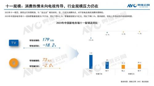 传统促销节点对于中国彩电行业的效力进一步减弱,行业仍面临规模压力。据奥维云网(AVC)全渠道推总数据显示,2023年十一促销期(23W39-23W41:23.09.18-23.10.08),中国彩电市场零售量规模为179万台,同比下降18.2%;零售额规模为73亿元,同比下降2.0%,呈现出量额双降的局面。