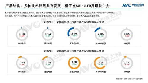 (五)技术升级:彩电企业在显示技术上的差异化布局上,推动了中国彩电行业多种技术路线的共存发展。线下市场作为高端体验阵地,新技术产品占比及增速相对更高,尤其是量子点和MiniLED产品,已成为中国彩电新技术市场的增长主力。