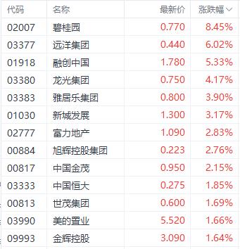 受益于9月一线城市房价率先企稳,今日港股房地产股出现小幅反弹,其中碧桂园、远洋集团、融创集团分别上涨8.45%、6.02%、5.33%。