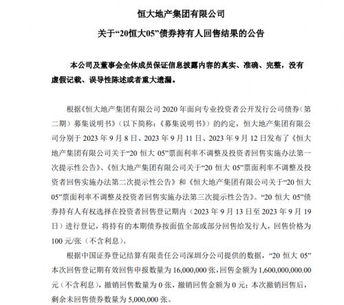 同时中国恒大(03333.HK)也传来利好消息,根据恒大地产集团深交所公告,将“20恒大05”回售部分债券的兑付日从2023年10月19日调整至2024年10月19日的提议获得了持有人同意。