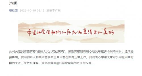 碧桂园在19日发布了一份声明,表示注意到有关“创始人父女或已离境”的谣言。这些谣言被有意地发布在多个网络平台上,对该公司造成了恶劣的影响。公司创始人和集团董事会主席目前在国内正常工作。