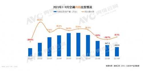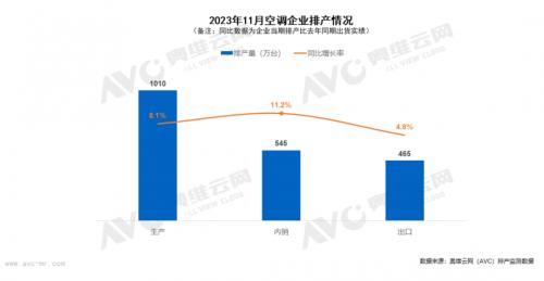 根据奥维云网(AVC)最新排产监测数据显示,2023年11月家用空调排产1010万台,同比增长8.1%;其中内销排产545万台,同比增长11.2%;出口排产465万台,同比增长4.8%。