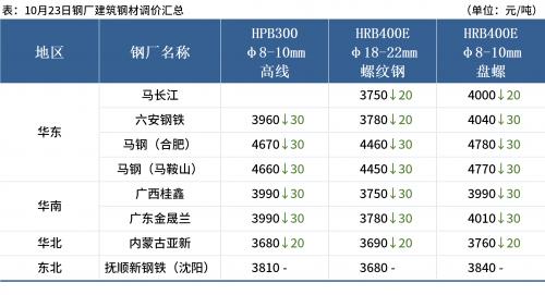 ◎10月23日,40家独立电弧炉建筑钢材钢厂平均成本为3861元/吨,环比上周五下降31元/吨。平均利润亏损109元/吨,谷电利润亏损11元/吨,环比上周五增加22元/吨。