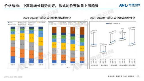 从价格结构看,嵌入式微蒸烤产品中高端增长趋势向好,均价整体呈上涨趋势,结构不断上行。根据奥维云网(AVC)监测数据,2023年1-9月,嵌入式微蒸烤线上市场6000元以上价格段零售额占比为28.1%,较同期增长9.2个百分点;嵌入式微蒸烤线下市场11000元以上价格段零售额占比为22.2%,较同期增长3个百分点。