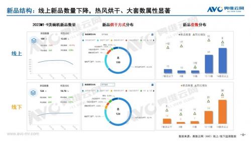 从新品结构来看,线上新品数量下降,热风烘干、大套数属性显著
