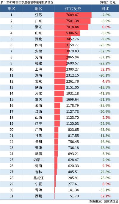 住宅投资方面,江苏、广东和浙江排名前三,且投资额均超7000亿。累计同比方面,有7个省市同比增长,其中西藏增幅最大,同比增长52.1%;有18个省市同比降幅超10%。