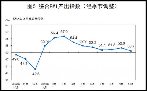 10月份,综合PMI产出指数为50.7%,比上月下降1.3个百分点,表明我国企业生产经营活动总体扩张,但扩张速度放缓。