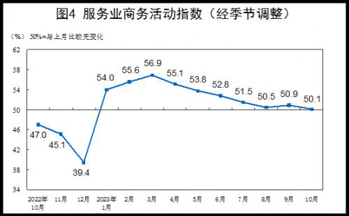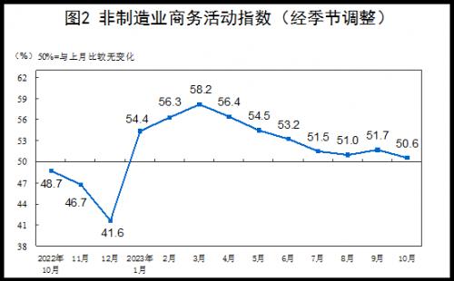 10月份,非制造业商务活动指数为50.6%,比上月下降1.1个百分点,仍高于临界点,非制造业总体保持扩张。