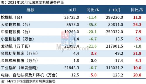 国家统计局最新数据显示,2021年10月挖掘机产量26725台,同比下降11.4%,降幅较9月缩窄5.7个百分点;环比略增3.2%,连续两个月环比增长。1-10月累计产量299230台,同比增长11.9%。