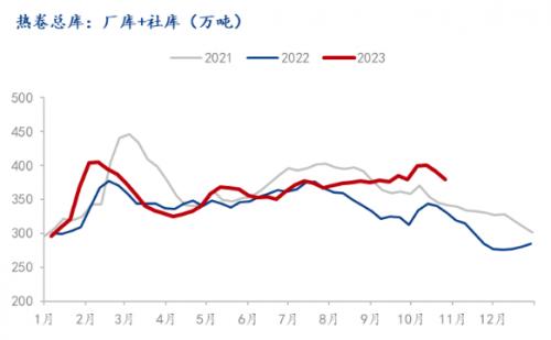 11月热卷价格走势预计先涨后跌。一万亿国债的政策利好,以及后续金融工作会议等预期将继续促进钢价走强,但宏观利好逐渐被市场消化后,价格终将回归至基本面,进入十一月份,热卷下游订单并没有明显恢复,且利润较差的情况下,市场拒绝主动补库存的意愿将延续。且伴随着钢厂利润继续收缩的态势,距离达到触发集中主动减产的临界点已经十分接近,对于供应减量最大的预期也是在十一月体现。需求端来看,出口虽延续高位运行,但已连续两个月边际走弱,这意味着高点已现,来自外需的增量空间后期难以看到,在内需弹性较小的情况下,若十一月供弱需平,供需矛盾将缓慢开启去化进程,预计十一月热卷价格在减产开始后震荡下行,随着钢厂利润修复后重新复产,价格随之企稳,最终供需关系将逐渐达到弱平衡。