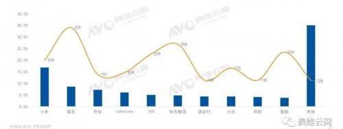 在品牌端,到2021年9月,线上市场在售家用监控摄像头产品的企业已达200多家,其中不乏小米、360、华为智选等耳熟能详的大品牌。据奥维云网(AVC)线上监测数据显示,2021年三季度,TOP5品牌份额为43.6%,TOP10品牌份额为65%,整体行业集中度并不高,依旧处于群雄割据的竞争环境。
