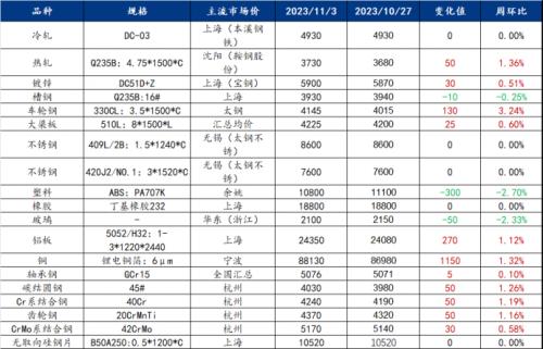 截止2023年11月3日,各原材料当日即时价格以及价格周环比情况如下:
