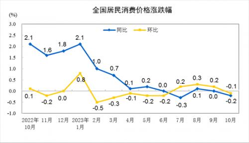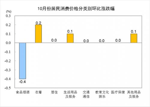 10月份,全国居民消费价格环比下降0.1%。其中,城市下降0.1%,农村下降0.1%;食品价格下降0.8%,非食品价格持平;消费品价格下降0.1%,服务价格下降0.1%。