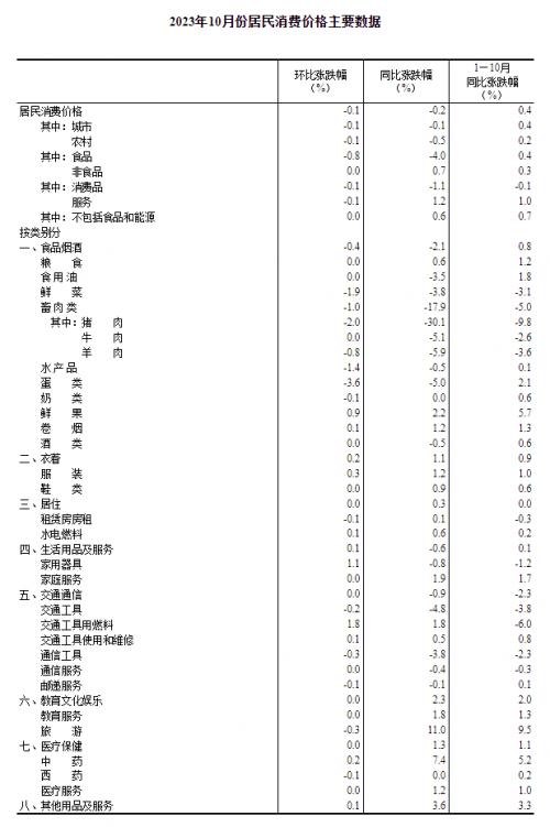 2023年10月份,全国居民消费价格同比下降0.2%。其中,城市下降0.1%,农村下降0.5%;食品价格下降4.0%,非食品价格上涨0.7%;消费品价格下降1.1%,服务价格上涨1.2%。1—10月平均,全国居民消费价格比上年同期上涨0.4%。