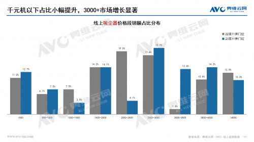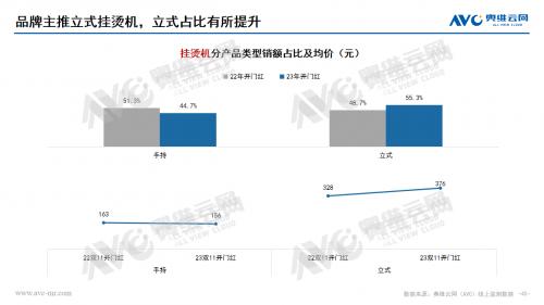 挂烫机:从市场表现来看,挂烫机整体市场没有明显修复。零售额、零售量的同比分别为-4.3%、-10.5%。从产品类型来看,立式挂烫机占比提升,同时也带动了整体均价的上扬。从价格分布来看,中低端产品仍是主流,但高端1000+有明显增长。