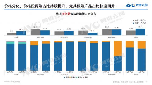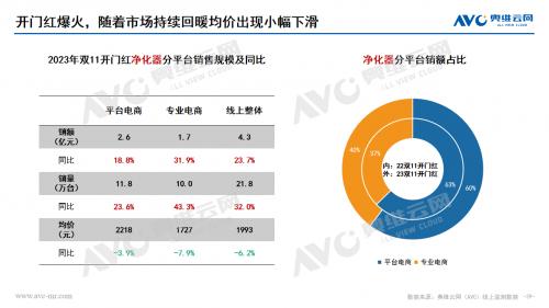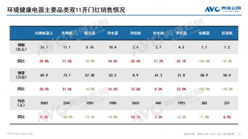 空气净化器:双十一开门“红”,空气净化器量额均有大幅度增长。从市场表现看,低端产品的上涨成为行业增长的重要推动力,而高端价位主要受消毒机产品拉动,提升较为明显。