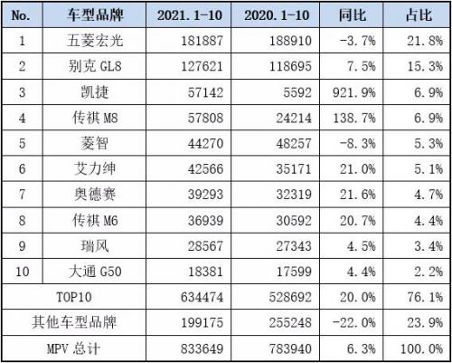今年以来MPV市场新能源车(纯电+插混)和普混车的销量表现超出预期。前10个月,纯电动(BEV)车销量达2.4万辆,同比增长330.5%;插混(PHEV)销量5360辆,同比增长87.1%;两者小计为2.9万辆,同比增长246.8%,在MPV市场的渗透率为3.5%。普混(HEV)销售8.2万辆,同比增长21.3%,渗透率为9.8%;传统燃油MPV销量72.3万辆,同比增长仅2.1%,渗透率为86.7%,传统车较上月渗透率有微量提升。
