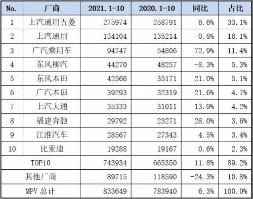 MPV前10企业累计销量为74.4万辆,同比增长11.8%,增长率高出整体MPV市场一倍;市场集中度为89.2%,回落0.3个百分点。在与上月的排名相比时,除了福建奔驰上升了一位,升为第八,江淮汽车下降一个位次外,其余排名基本一致。前10企业中,自主品牌占有54.2%,合资占有45.8%。