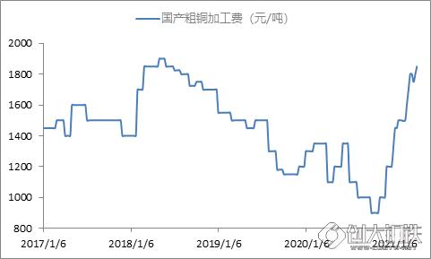 加工费方面,2020年下半年至今,粗铜加工费持续上涨,市场供大于求导格局明显。废铜价格优势明显促使国内粗铜生产企业保持快速生产,国产粗铜供应充裕,进口量也维持较高水平。目前国产粗铜加工费已上涨至1850元/吨,进口价格在190美元/吨。受产能需求限制,短期粗铜供大于求格局难改。目前持货商已存惜售挺价情绪,价格继续上涨空间有限,但难见下跌。