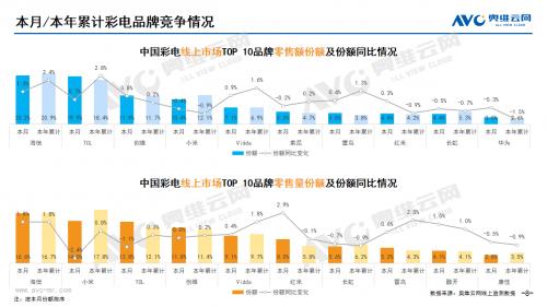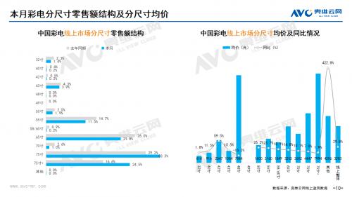 彩电:据奥维云网(AVC)线上市场监测数据显示,10月彩电线上零售额规模同比增长9.8%;均价为3283元,同比29.8%;15000+的彩电零售额占比3.4%,同比0.3%;不同彩电尺寸中,75寸+彩电零售额占比24.5%,同比7.9%。