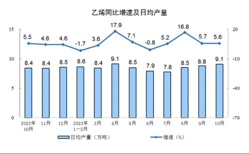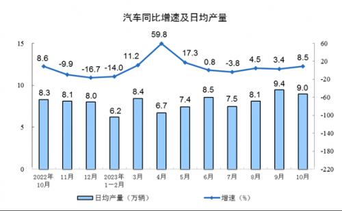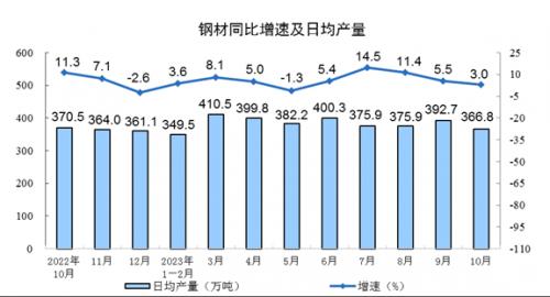 分产品看,10月份,620种产品中有371种产品产量同比增长。钢材11371万吨,同比增长3.0%;水泥19121万吨,下降4.0%;十种有色金属655万吨,增长8.2%;乙烯282万吨,增长5.6%;汽车277.9万辆,增长8.5%,其中新能源汽车92.7万辆,增长27.9%;发电量7044亿千瓦时,增长5.2%;原油加工量6393万吨,增长9.1%。