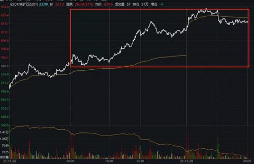 作为钢铁的基础原材料,铁矿石价格自今年7月中旬以来一路走低,4个月的时间跌幅超50%。近期国内铁矿石港口库存从1.2亿吨攀升至接近1.6亿吨。但最近几个交易日铁矿石期价开始回暖,昨日下午收盘铁矿石主力合约大涨近5%,重新突破600元/吨,新加坡铁矿石期货涨近8%。昨日夜盘时段,铁矿石期价继续上涨,截至23时收盘,铁矿石再度涨超4%。从昨日早盘算起到昨日夜盘收盘,铁矿石期货2201合约上涨5.79%。
