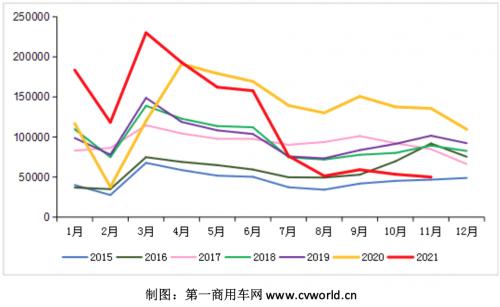 截止到目前,重卡市场已经连续四个月(8-11月)呈现出同比降幅超过60%,连续五个月降幅超过45%。如“2015-2021年我国重卡市场销量月度走势图”所示,代表2021年的红色曲线,1月份直至4月都居于最上端;从5月份开始,销量出现首次下滑,代表2021年的红色曲线掉到了代表2020年的黄色曲线下方,市场连续两个月呈现出温和下滑;三季度和四季度,重卡行业需求及订单情况快速“恶化”,市场月度走势呈现出陡峭的下降曲线:7月份销量同比大幅下滑45.2%;8月份销量同比下降60.5%;9月份,“金九”变成了“铜九”,月销量不到6万辆,同比下滑60.7%;10月份,重卡市场销量同比下降61.1%;11月份,重卡市场销量环比下滑6.5%,比去年同期的13.56万辆下降了63.1%,月销量创下年内最低,也是最近六年来11月销量的最低水平。